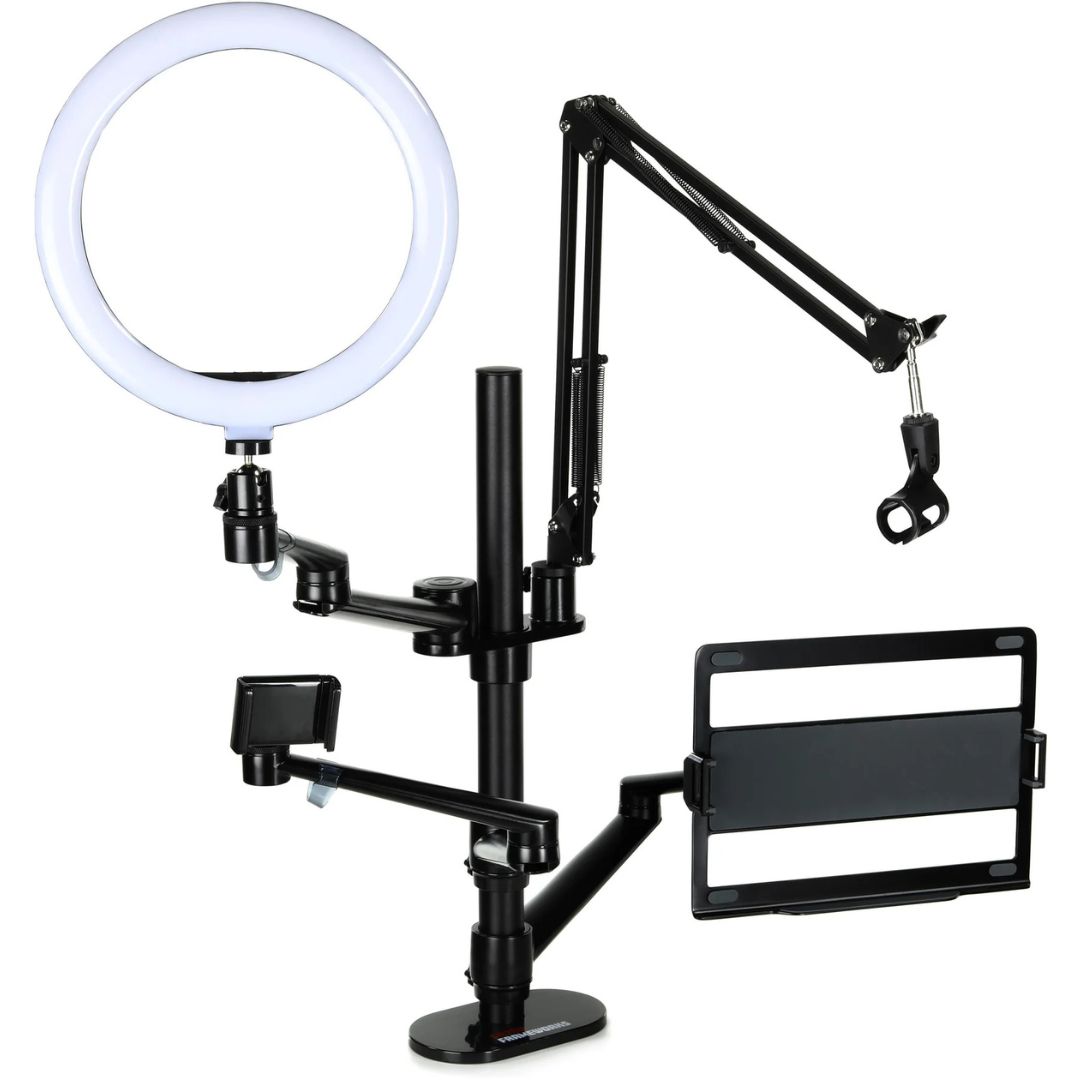 Limited Quantity Available! | Desk-Mounting Media Stand with Ring Light, Mic Boom Arm, VESA Mount, and Stands for Tablet, Laptop, and Smartphone Original Price: $179.99 Limited Time Deal: $114.50 (36% off!) |