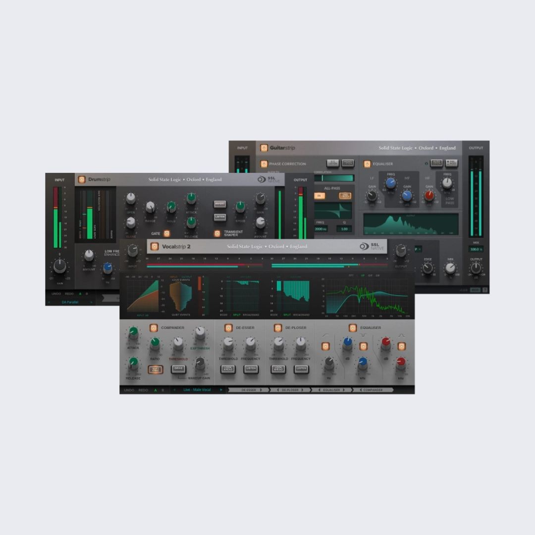 Why only use focused processing on a single instrument? Treat the whole band with raw processing power with this exciting new bundle from Solid State Logic including their Vocalstrip 2, Drumstrip, and Guitarstrip plugins.