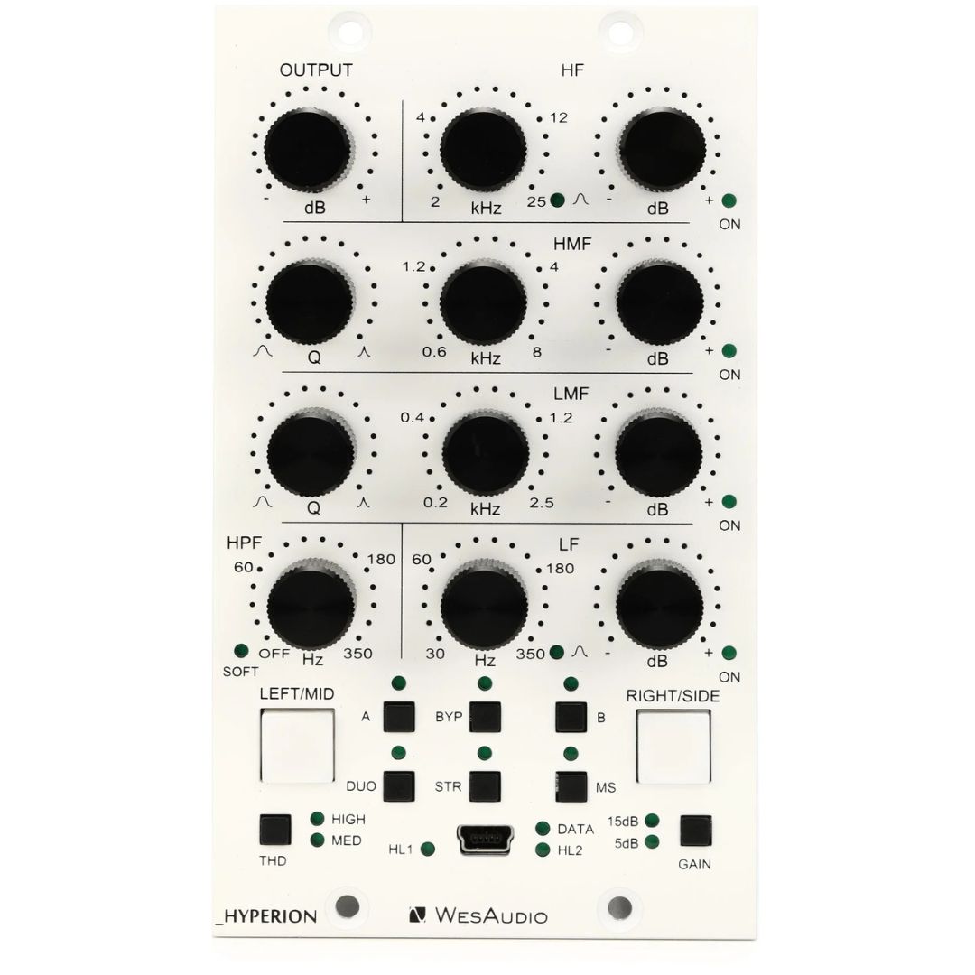 The WesAudio Hyperion is a 500 Series stereo/dual-mono/mid–side 4-band analog EQ with digital recall that gives you complete control via its companion plug-in. Connectivity to your computer is handled via a front-panel USB port — or by a special rear-panel connector.