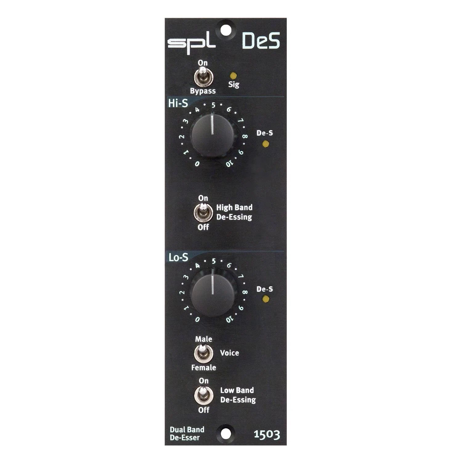 The SPL Dual-Band De-Esser uses two frequency bands that can be used independently or jointly. Two de-esser stages increase processing effectiveness without introducing audible artifacts.